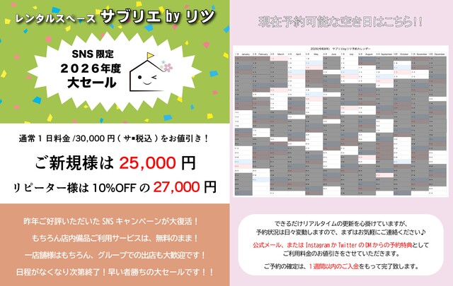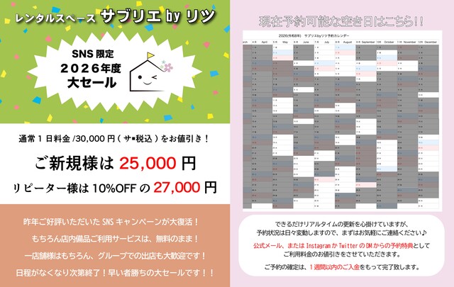 2026年度のご予約もサブリエbyリツは人気のセールの継続中ですので、是非ご利用下さい!