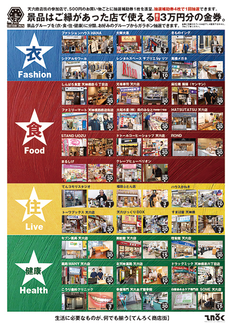 天神橋筋六丁目商店街〒530-041大阪市北区天神橋筋6丁目5番17号TEL:06-6358-0035 FAX:06-6358-0034